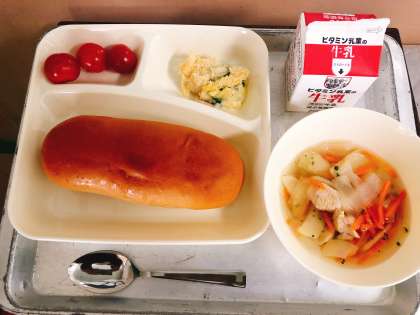【ほたて貝のグラタン、だいこんのスープ、プチトマト、黒糖パン、牛乳】
