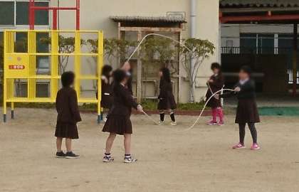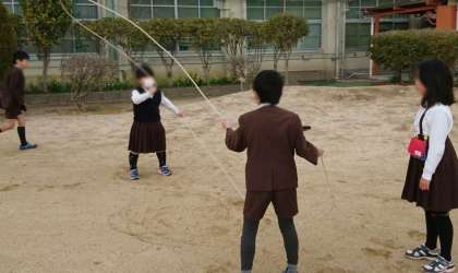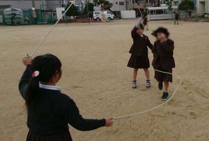 低学年は、先生たちに縄を回してもらっていたので、縄の回しかたのポイントは知りません。見たままをマネながら回していました。はじめにジャンパーの子が縄を引っ張って縄が絡まないように工夫をして、ダブルダッチをしていました。