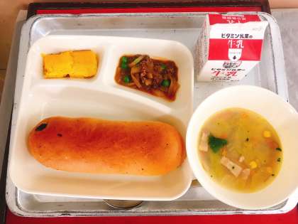 【牛肉のデミグラスソース煮、コーンスープ、かぼちゃのプリン、レーズンパン、牛乳】