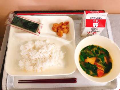 【あげ鶏のねぎソースかけ、あつあげとはくさいの中華煮、焼きのり、ごはん、牛乳】