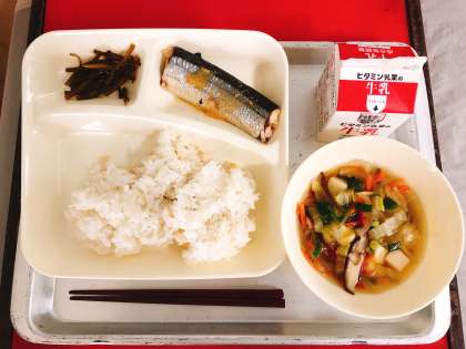 【さんまのみぞれかけ、すまし汁、茎わかめのつくだ煮、ごはん、牛乳】