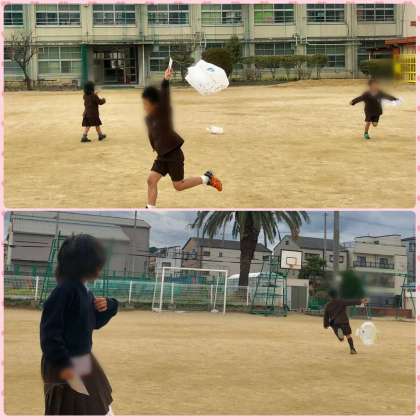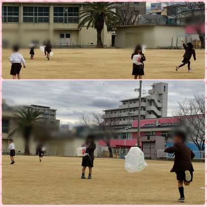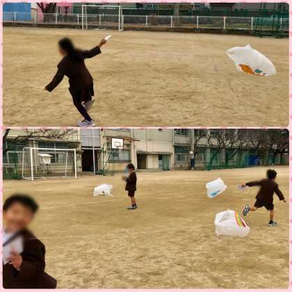 スーパーマーケットでよく使われるポリ袋を使って凧を作り、凧揚げをしました。