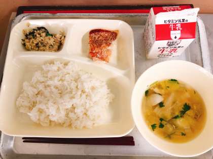 【赤魚のレモンじょうゆかけ、うすくず汁、高野どうふのいり煮、ごはん、牛乳】