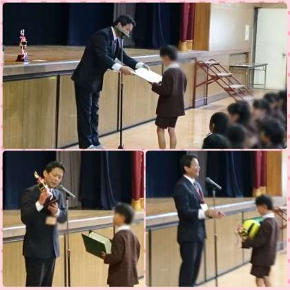 ドッジボールのチームに所属している児童が、頑張った結果、大阪の大会で賞をいただきました。今日は、児童集会の終わりに、みんなの前で表彰されました。