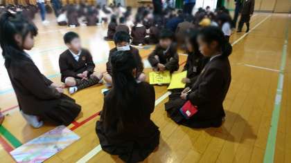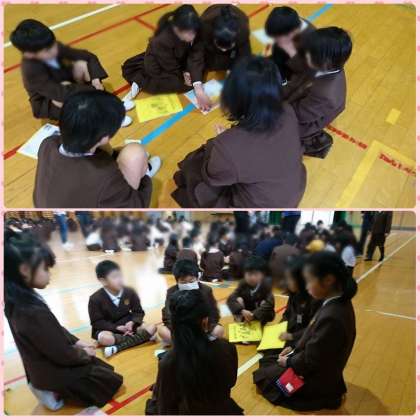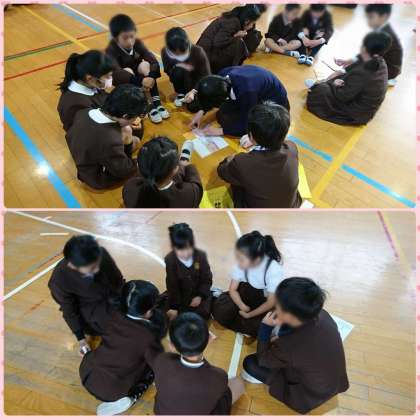 6年生の卒業を祝う会の準備の1つ。お祝いカードをハッピーグループごとで作りました。