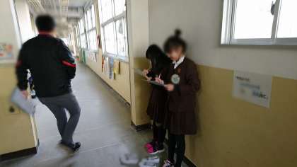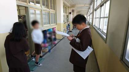 児童会活動で、5年生の児童が、休み時間廊下にたって、廊下を歩こうと呼びかけ、みんなの行動を観察しました。
