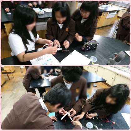 理科の特別授業で、相談しながらモーター作りの実験をしている様子です。