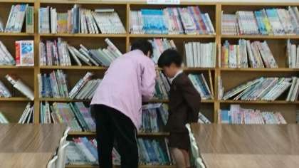 写真の児童は、どの本を借りようかと、図書館ボランティアさんと一緒に探しています。