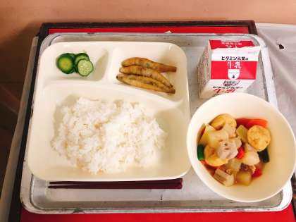 【きびなごてんぷら、一口がんもとだいこんの煮もの、あっさりきゅうり、ごはん、牛乳】