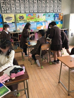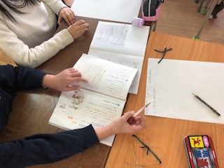 国語科の学習では、アンケートをとって、ポスターを作り、報告しあう学習をしています。どんなアンケートにするか、項目を考えて・・・・。