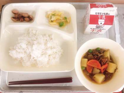 【肉じゃが、はくさいのゆず風味、とら豆の煮もの、ごはん、牛乳】