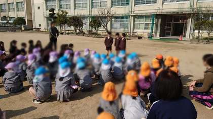 1年の全体での挨拶のあと、1年生と幼児が1人ずつのペアになって、自己紹介をしました。