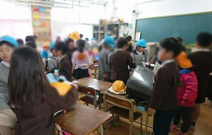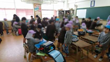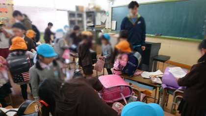 ロッカーからランドセルを出して、年長さんの人たちに、ランドセルをせおってもらいました。