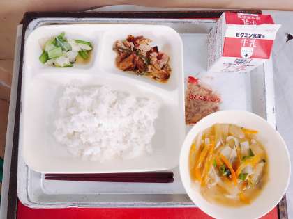 【豚肉のごまだれ焼き、みそ汁、こまつなのおひたし、ごはん、牛乳】
