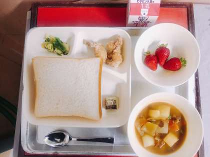 【フライドチキン、カレーシチュー、春のカラフルソテー、いちご、食パン、バター、牛乳】