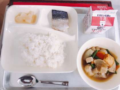【さばの塩焼き、あつあげとさといもの煮もの、だいこんのみそ煮、ごはん、牛乳】