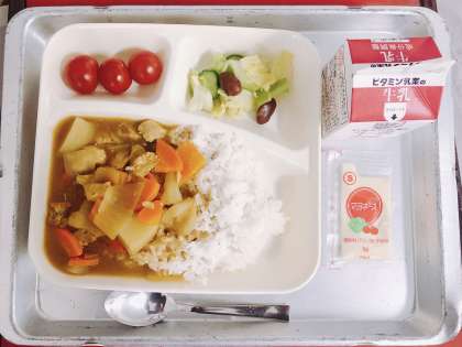 【チキンカレーライス、金時豆と野菜のサラダ、プチトマト、牛乳】