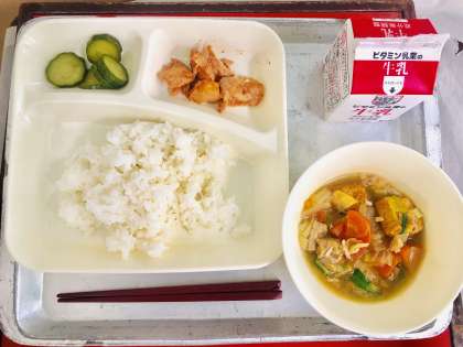 【鶏肉のチリソース焼き、中華煮、きゅうりの中華あえ、ごはん、牛乳】