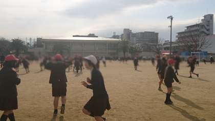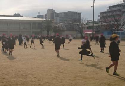 ひたすら追いかけて.タッチしたら鬼が増えていくゲーム。みんな精一杯走り、この時間を楽しみました。