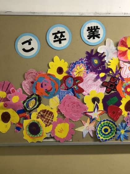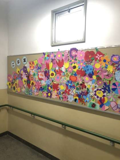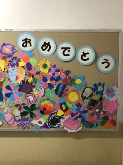 この壁面は、在校生のこどもたちが、卒業生にむけて心を込めて、作りました。