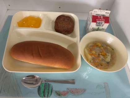 「豆乳スープ」は、じゃがいも、キャベツ、たまねぎ、コーン、にんじん、彩りにパセリを使用し、仕上げに豆乳を加えます。