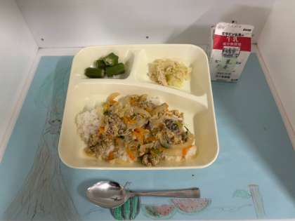 「オクラの甘酢あえ」は、焼き物機で蒸したオクラに砂糖、塩、米酢、うすくちしょうゆで作ったタレをかけ、あえます。