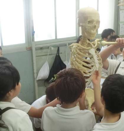 理科「ヒトの体のつくりと運動」では、体を曲げることができるところの特徴、腕を曲げるときの筋肉のはたらきについて学びました。骨や筋肉、関節については言葉として知っている子どもたちに、骨の様子をより詳しくつかませようと骨格模型を使いました。