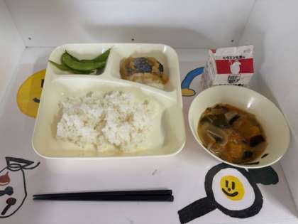 「かぼちゃのみそ汁」は、かぼちゃ、たまねぎ、にんじん、えのきたけ、わかめを使用しています。