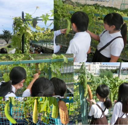 春から育ててきたヘチマの様子を観察しました。ヘチマの葉の変化や実の様子を手や鼻を使って観察しました。葉や実の感触、実のにおいの違いを見つけました。