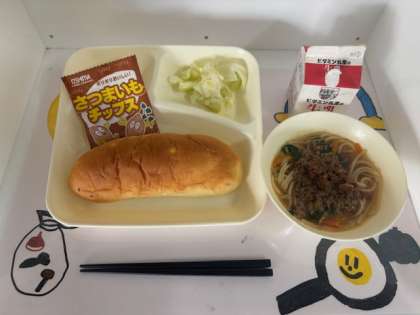 「タンタンめん」は、チンゲンサイ、もやし、にんじんを使った汁めんに、牛ひき肉、豚ひき肉、白ねぎ、しょうが、にんにくをごま油で香りよくいため、タンメンジャンや赤みそなどで味つけした肉みそを配缶時にのせて食べます。