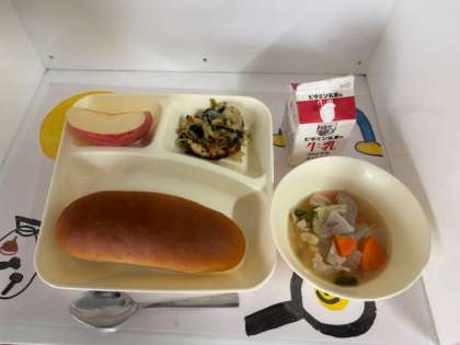 「ほうれんそうのグラタン」は、ほうれんそう、鶏肉などを使用しています。シチュールウの素などで味つけし、上新粉でとろみをつけています。乳・小麦を使用していないため、乳・小麦アレルギーの児童も食べることができます。