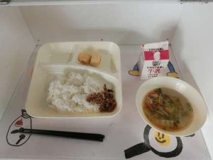 いかには、体をつくるもとになるタンパク質が多く含まれています。本日の「いかてんぷら」は小麦粉とでん粉で作った衣がついたものを、給食室で揚げています。