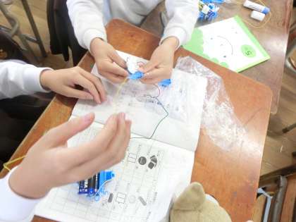 乾電池の+極と−極をそれぞれ豆電球につながっている導線とつなげれば、明かりがつくことをふまえて、今回は回路の中にどのような素材をはさめば明かりがつくのか予想し、実際に確かめました。身近なものから教室内へと探す範囲は広がり、「ロッカーはつくと思ったのに・・・」「先生のめがねはどうかな?貸してください」と言いながら楽しく活動しました。次回は、明かりがついたものとそうでないものをグループに分けて、電気の性質をまとめます。この学習のゴールは、人の体と電気の関係(落雷とAED)を学ぶことにします。