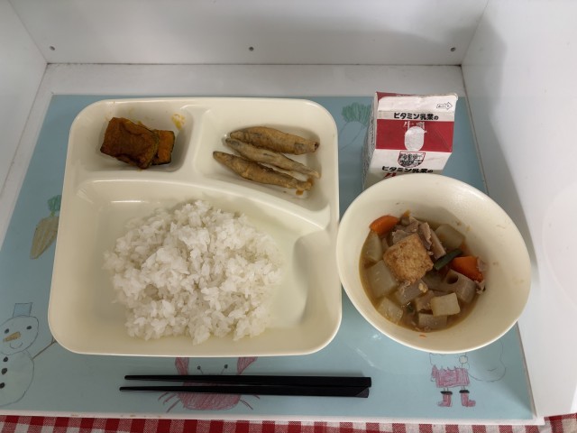 「焼きかぼちゃの甘みつかけ」は、焼き物機で焼いたかぼちゃに砂糖、塩、こいくちしょうゆで作ったみつをかけます。今年の冬至は、12月22日です。冬至にかぼちゃを食べると、かぜをひかずに健康に暮らせるといわれています。