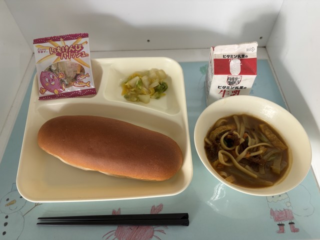 「カレーうどん」は、牛肉、うすあげ、たまねぎ、にんじん、青みに青ねぎを使用しています。寒い時期に体の温まる一品です。