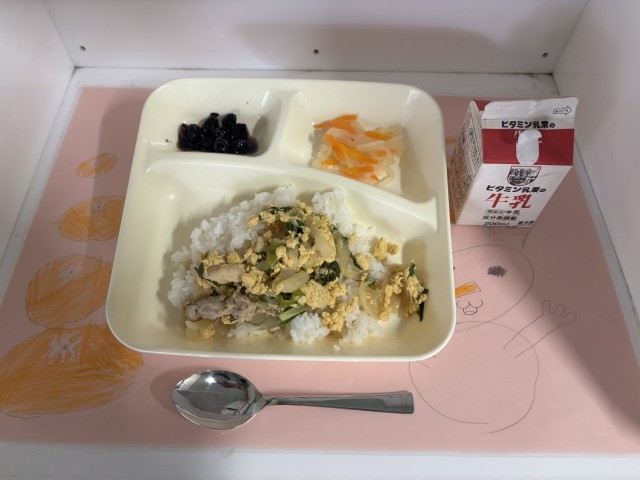 「親子丼」は、鶏肉、たまねぎ、青ねぎを甘辛いだしで煮て、卵を加え、配食時にご飯を盛りつけた上にかけます。