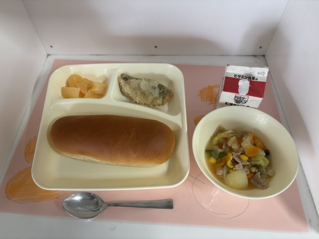 「あじのレモンマリネ」は、1人1枚のあじを油であげ、たまねぎ、レモン、砂糖、塩、こしょう(白)、米酢、ワインで作った調味液を配缶時にからませます。