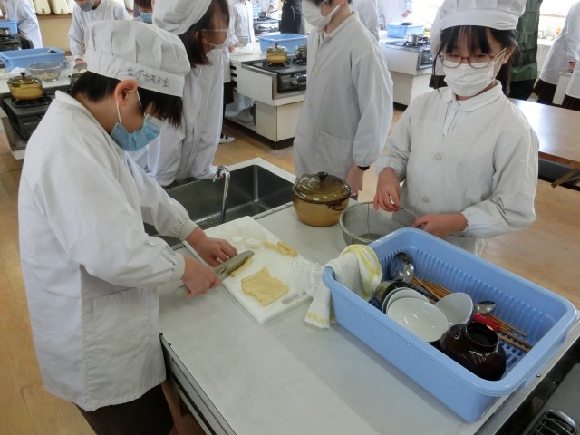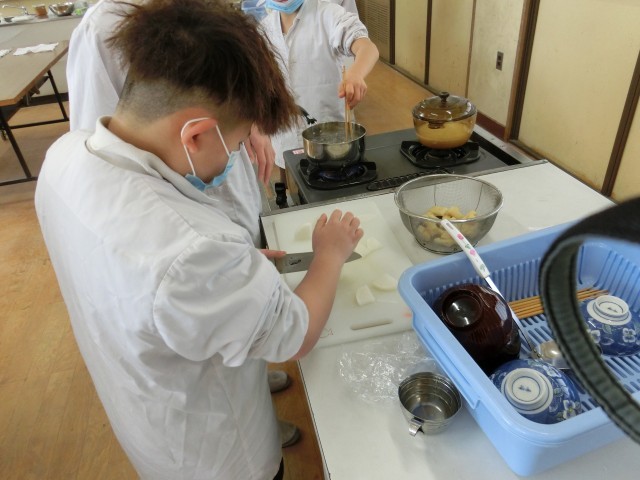 丁寧な包丁さばきで大根とうすあげを一口大に切る姿。とても熱心に取り組んでいました。