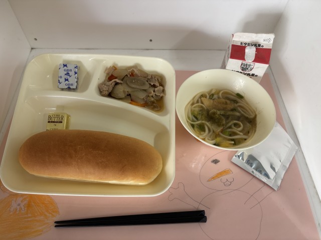 「なにわうどん」は、三角形に切ったうすあげを砂糖、みりん、こいくちしょうゆで味つけし、焼き物機で煮ます。かまぼこ、はくさい、青みに青ねぎを加え、だしの旨みを味わうことのできるシンプルなうどんに仕上げています。喫食時にとろろこんぶを1人1袋入れていただきます。