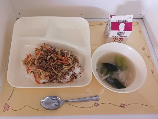 今日のビビンバの具は、コチジャンで味付けした肉と切干しだいこん・きゅうり・にんじんで作ったナムルです。