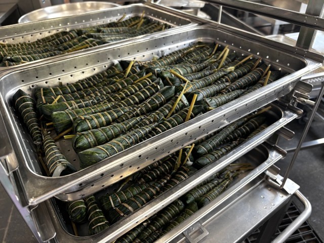 ちまきは、うるち米の粉などで作った餅を笹の葉で包み、い草で巻いて作られています。大阪市の学校給食のちまきは、原材料はすべて国産で、市販されているものと比べ、糖分を控えた大阪市独自のものです。児童の成長を願い、こどもの日の行事献立として毎年登場しています。