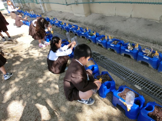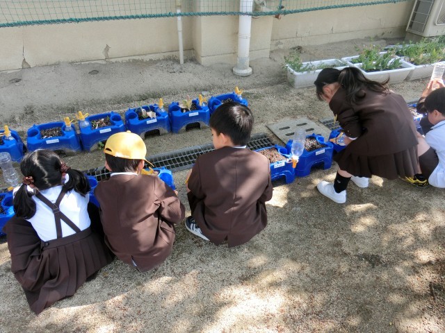 種をじっくり観察しながら「石ころみたいだね」「本当にここから花が咲くのかな」