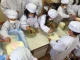 4月14日(木)、今日の給食は初めて1年生がご飯をよそったり、スープを注いだり...