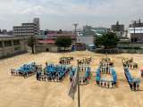 本日は、100周年記念航空写真撮影を行いました。 児童は南側プールの方を向...