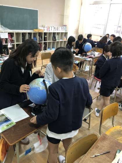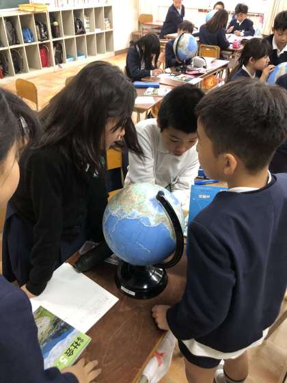 地球儀を使ってその様子を考え、友だちと話し合っています。