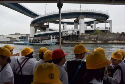 めがね橋の下の渡し船に乗って対岸へ。初めて船に乗る子どももいて、みんな喜んでいました。