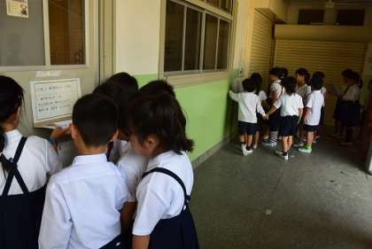 学校にも慣れてきた1年生を、2年生がリーダーになって校内を案内しまし