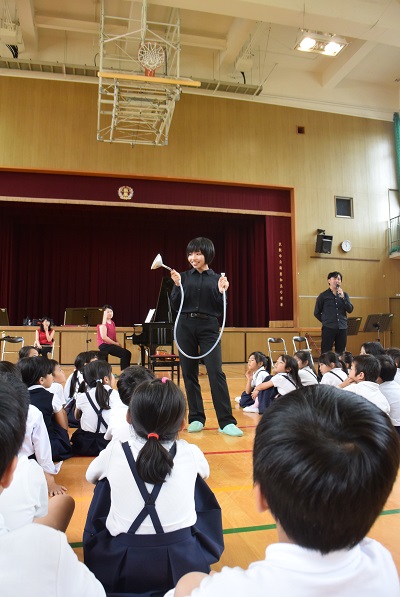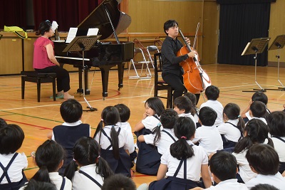 フルート・トランペット・チェロ・ピアノ奏者が来校され、目の前で本物の音を聞かせてもらいました。