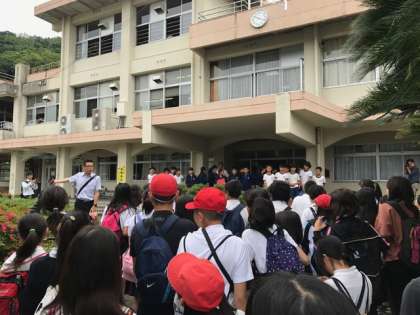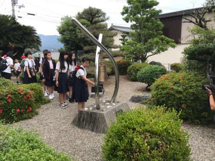 南恩加島小学校にもある「平和の鐘」を鳴らし、体育館へと向かいます。