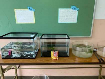 5年生の教室の前と理科室の前には・・・かわいいメダカたちが(^^)